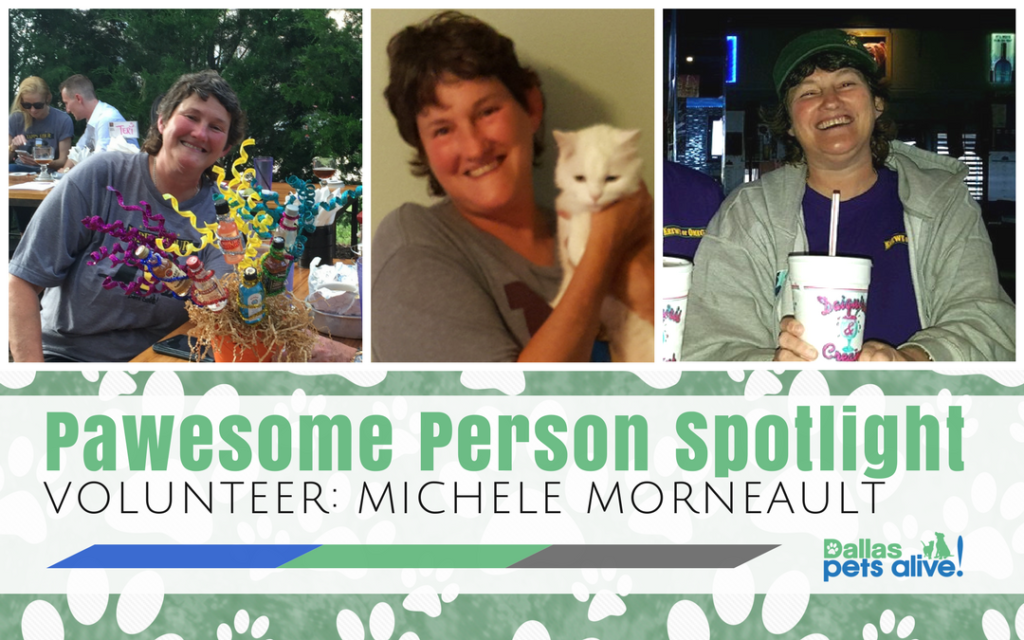 Michele is always willing to step up to the plate when needed whether it be to help raise donations, educate people on DPA! and our mission, go pick up a truckload of donated crates, or bring in puppies needing a foster home. Her positive attitude is simply inspiring, no matter what our animals need she’s ready with a big smile on her face. She is one of the most genuinely caring people I know and always offers to help because it truly makes her happy to. Michele and JB recently had their 3-year DPA! anniversary and I couldn’t be happier to have them as part of our lifesaving family!”
