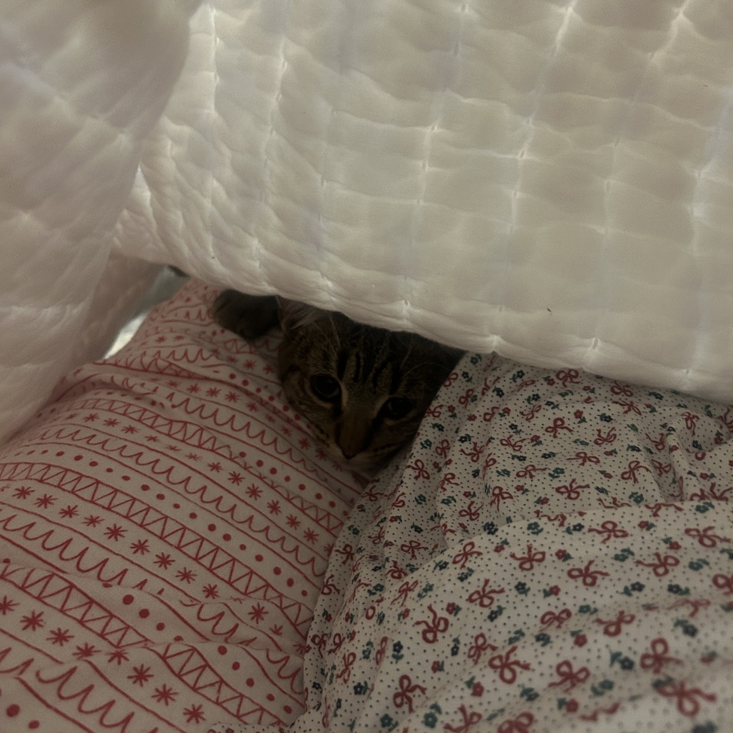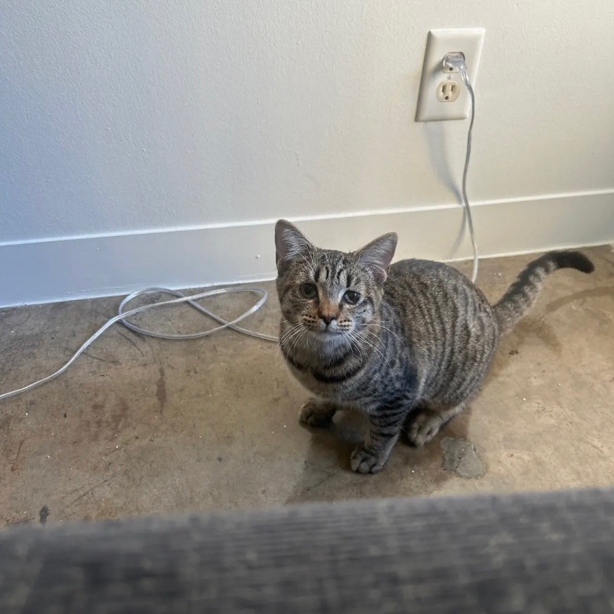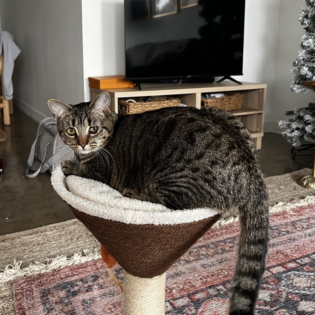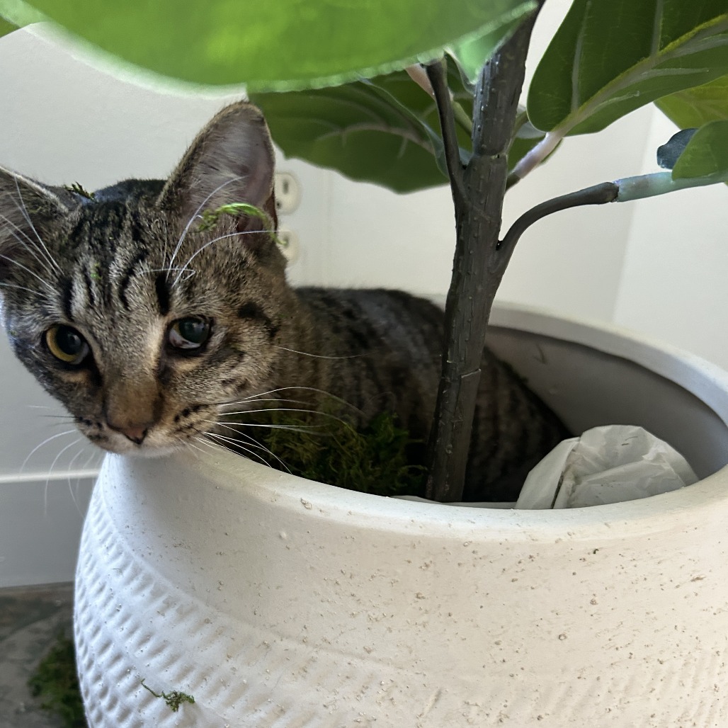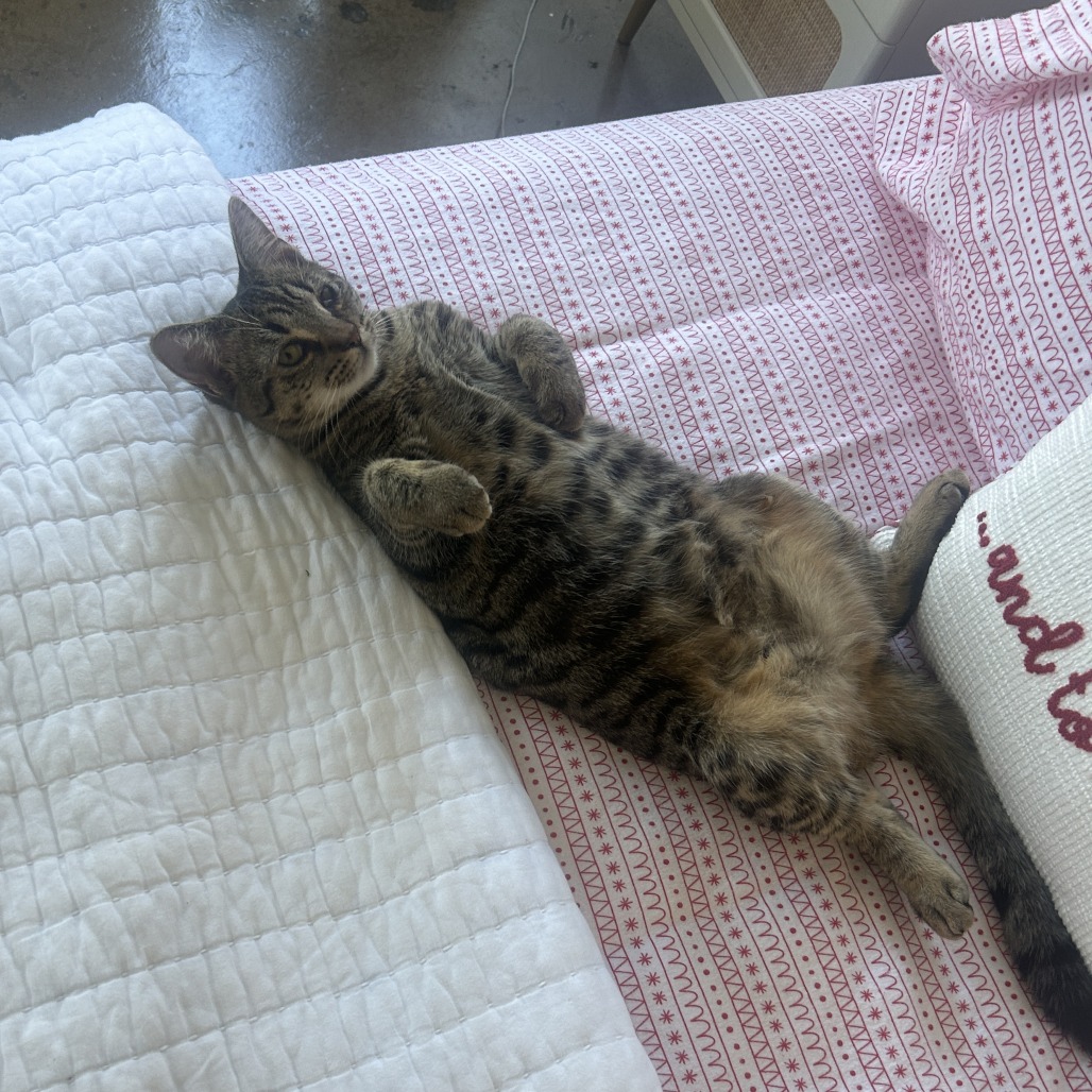 She is a very active young cat who would play all day long if you were willing to engage her. She really enjoys a feather wand and she has a stuffed doll that is a particular favorite. She hasn’t expressed an opinion on treats just yet. A mystery for you to uncover! Georgie is a very curious girl, so mysteries are great.