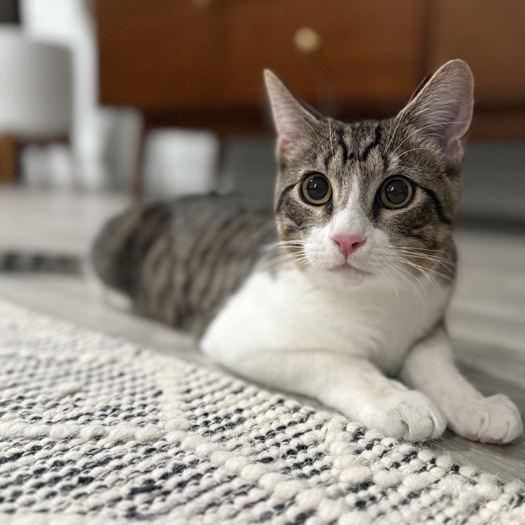 Meet Gimlet — the protective big brother of the Gin Cocktail trio, rescued from Mesquite Animal Services along with his siblings, Bramble and Vesper. Gimlet takes a thoughtful approach to the world. He’s playful and curious, but also a little shy when it comes to meeting new humans and animals. He is still learning that hands can bring love, pets, and treats. He loves to wrestle and romp around with his siblings, play with wand toys, and follow his human around like a little shadow.