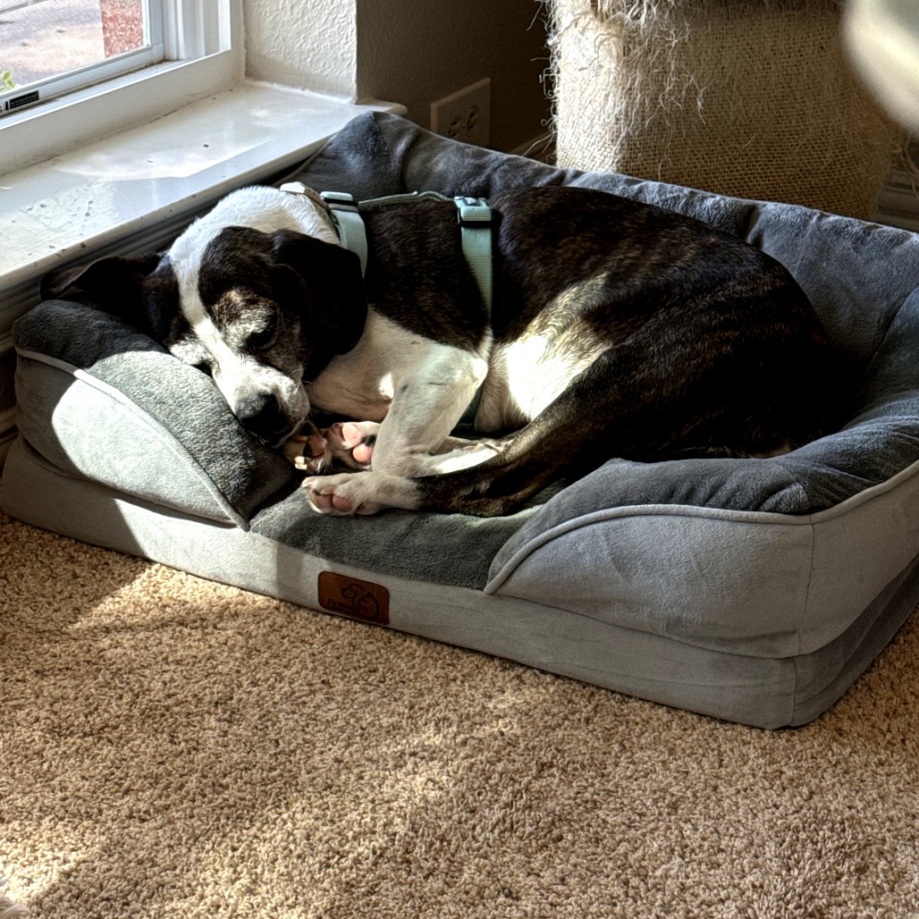 Honey’s a fan of walks, and with her lower energy level, a stroll is preferable to a run. She’s sweet and loving (and a fan of treats) and quite the cuddler. A forever home where she can relax and enjoy the social scene around her will be a perfect fit.