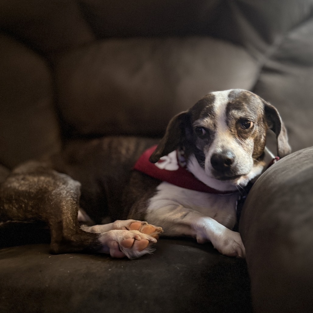 Honey Biscuit may be a senior lady, but she still has plenty of wiggle inside and out. This playful, ten-year-old beagle mix gets along well with dogs of all sizes. She enjoys being around people and whatever activities are bustling around her. When she gets excited, her hind end gets busy wiggling.
