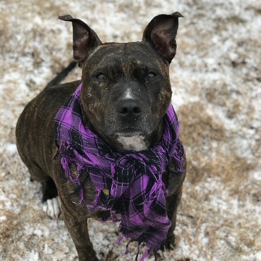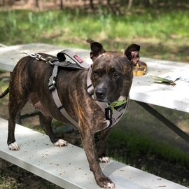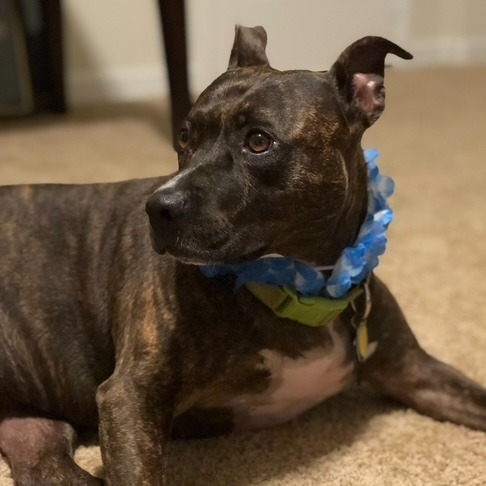 Meet Harley Quinn, AKA Harley. She is a beautiful brindle pit bull around 9 years young. She weighs around 63lbs.