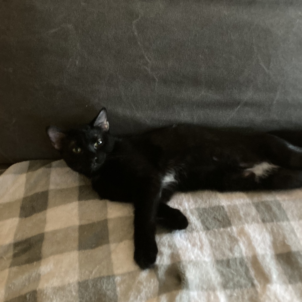 Meet sweet Hero! She is approximately 3yrs old and weighs a healthy 11lbs. She is all black with a little white on her tummy. She gave birth to six kittens on April 16, 2024 and was a great mommy to her babies!