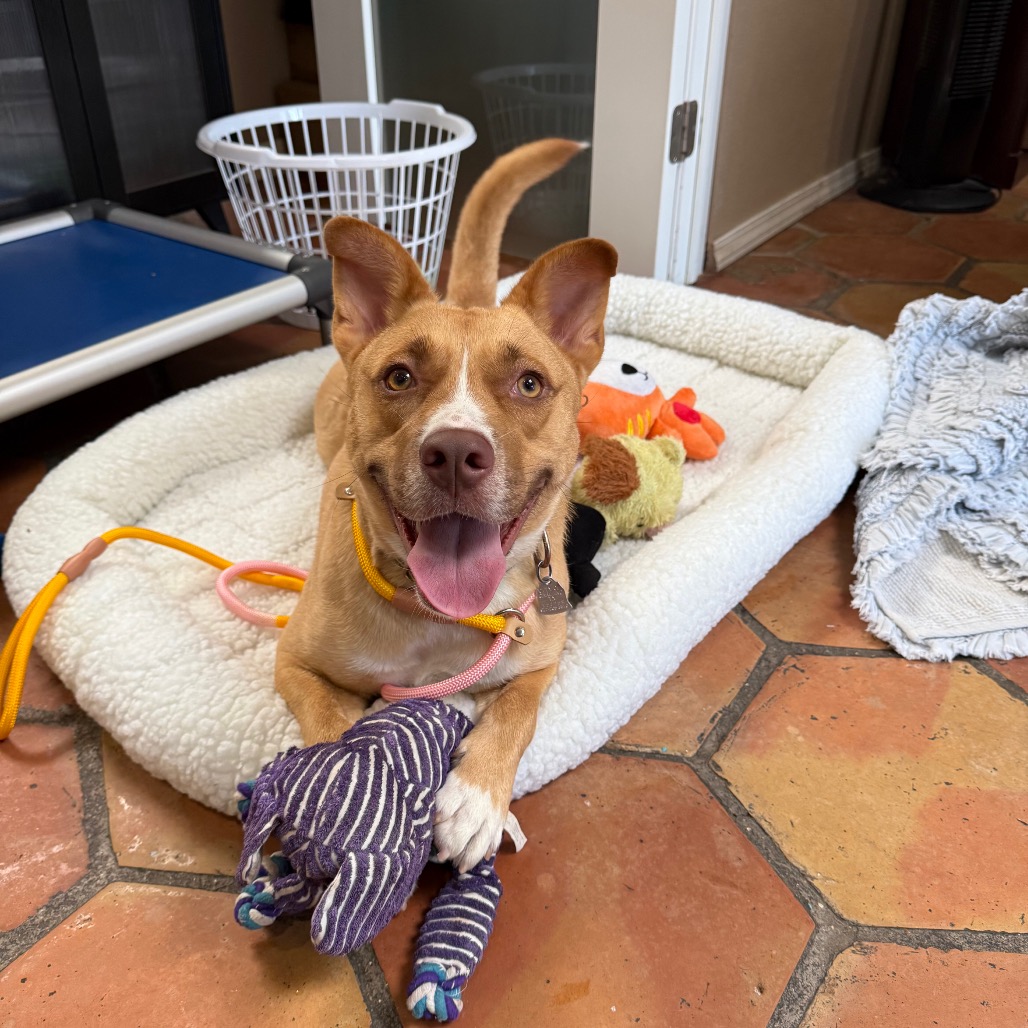 Fiesta is incredibly intelligent — the kind of smart that makes you laugh. She can figure out unanchored baby gates, notices everything, and wants to be involved in whatever you’re doing. She’s still working on house manners like jumping and counter surfing, but she responds well when redirected to toys (which she LOVES — especially squeakers, bones, and blankets).