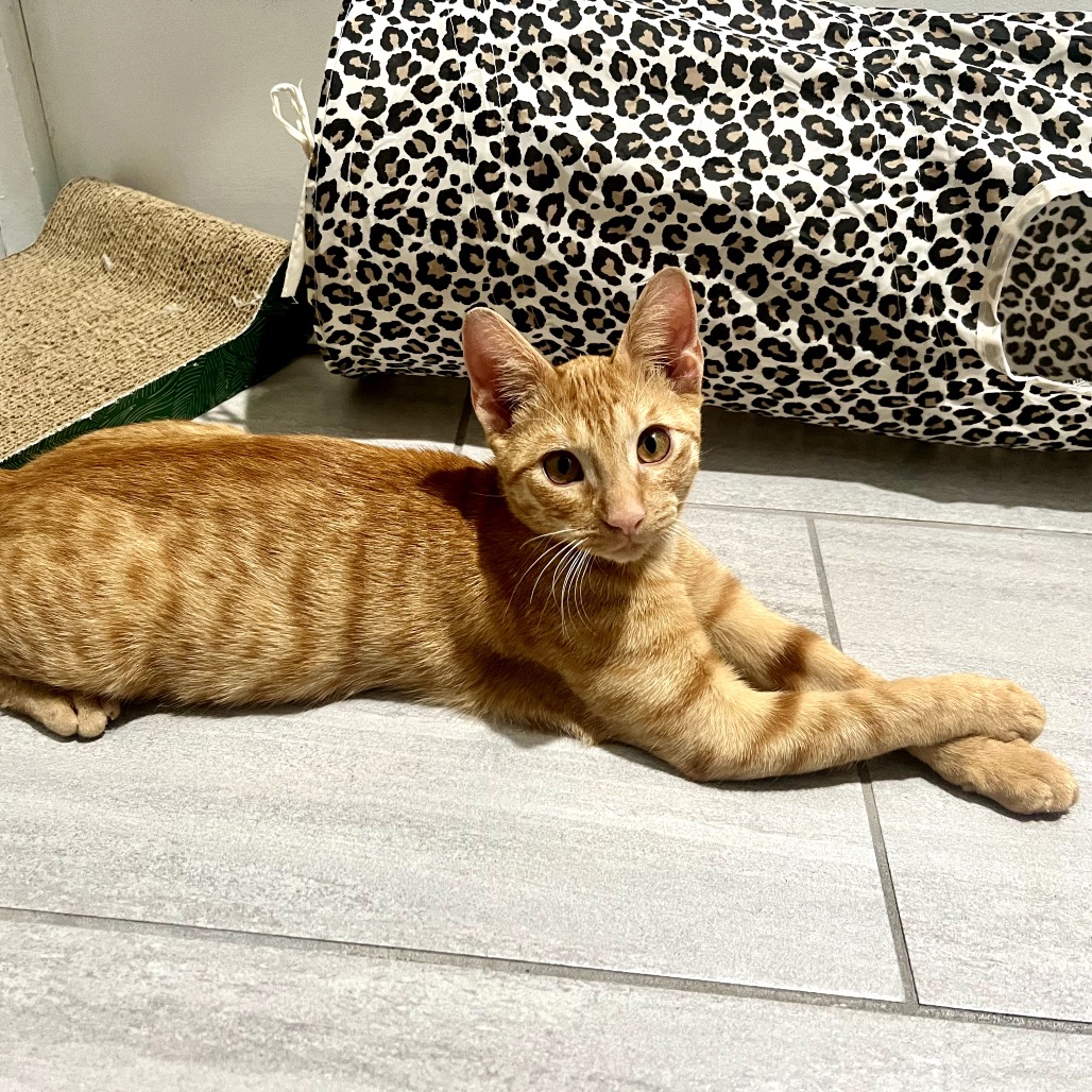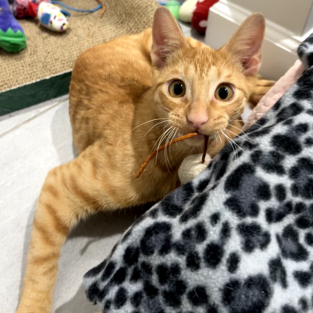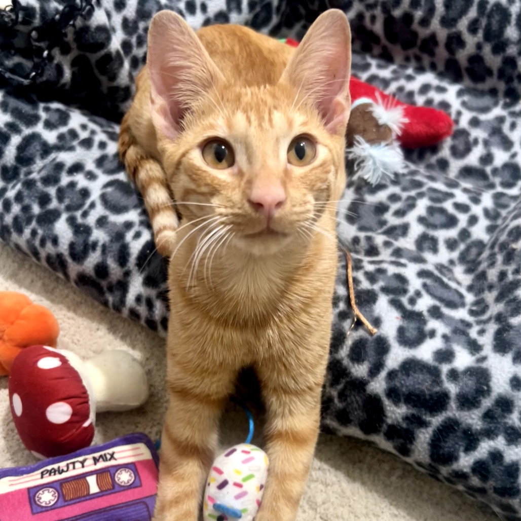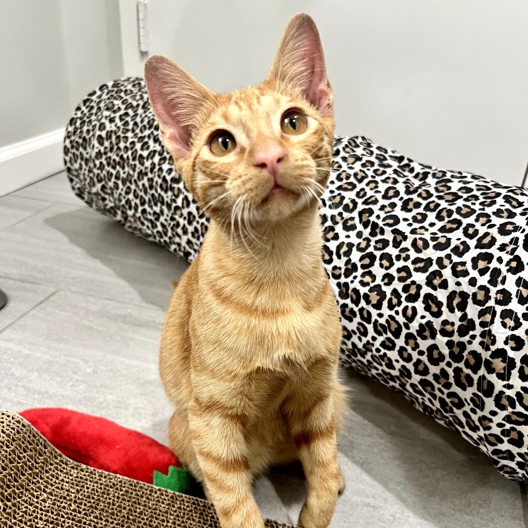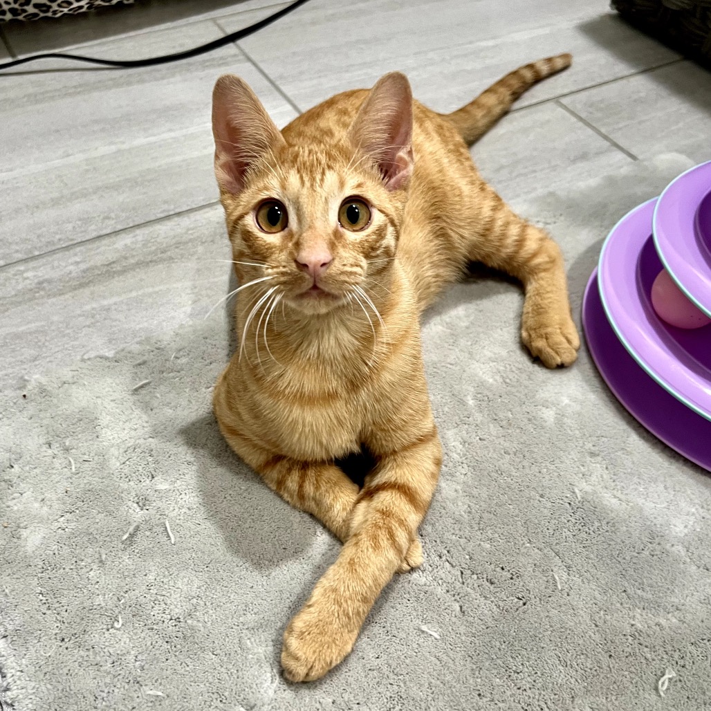 I’m a silly, playful boy who loves zooming around and chasing my favorite toy — those rattle balls with bells inside (they’re the best!). I also never say no to a Churu treat. 😻