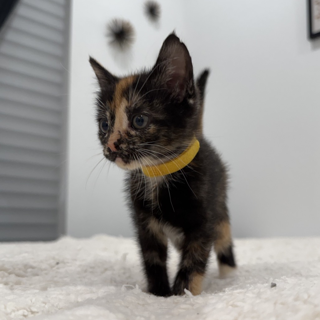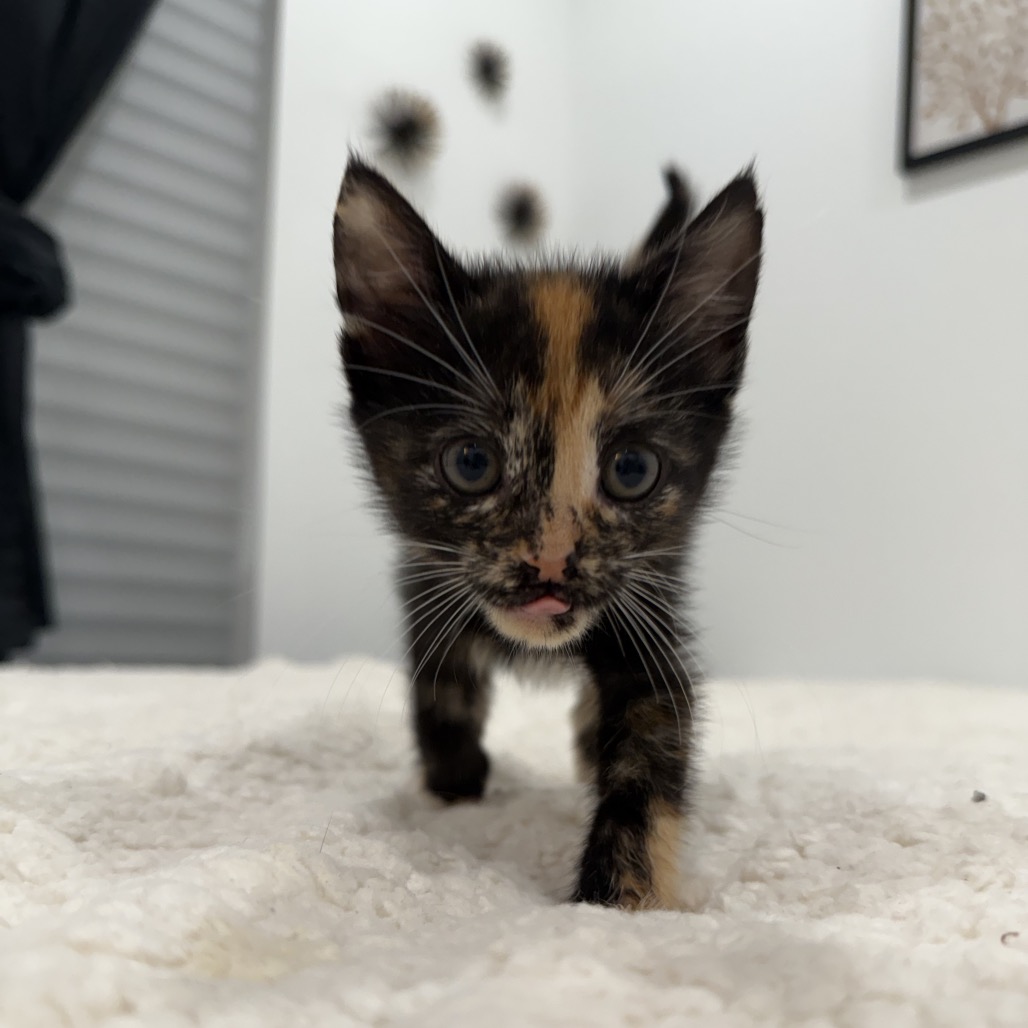 This sweet girl has a big heart and a special gift for always being right there beside you. Whether she’s perched at your feet or climbing onto your shoulder, she wants to be close to her favorite people at all times. Kahlua has high energy and adores climbing everything she can – shelves, cat trees, even you! Though a bit more reserved than her sisters at first, she quickly warms up with a gentle approach and some cozy time. She loves cuddling with her siblings and curling up in high places to keep an eye on the world.