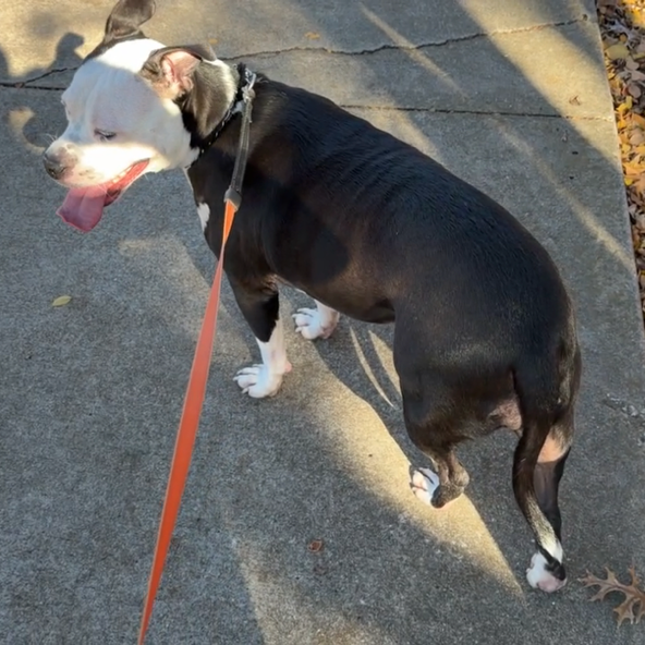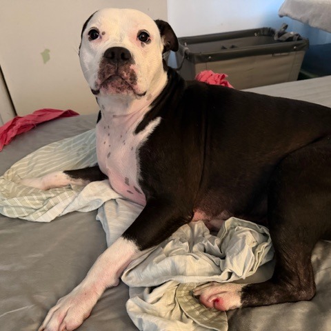 Meet Kitten! She is a black w/ white two and a half year, 66 lb, American Staffordshire Terrier.