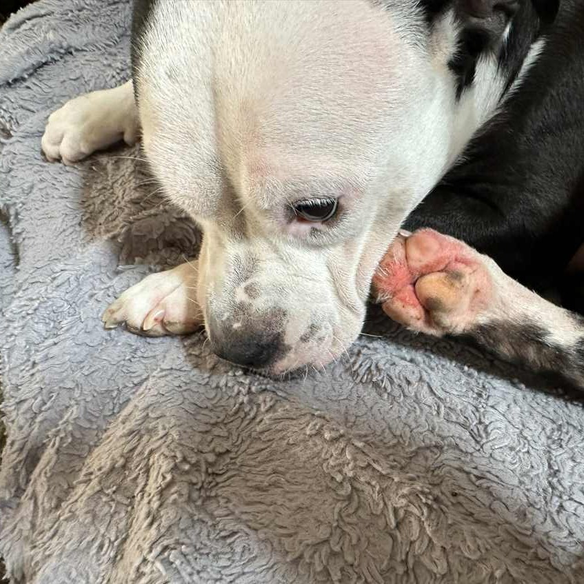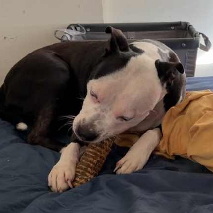 Kitten is a naturally protective Staffie. She’s got a bark like a machine gun but is friendly to most of the cats. I found her as a stray while walking my other pitbull. Unfortunately Kitten is allergic to something around the house and its difficult to keep her bathed often enough to be comfortable. When I see her chewing it takes up a lot of mental energy.