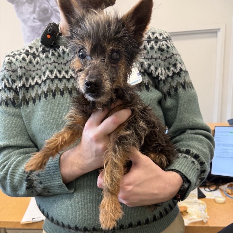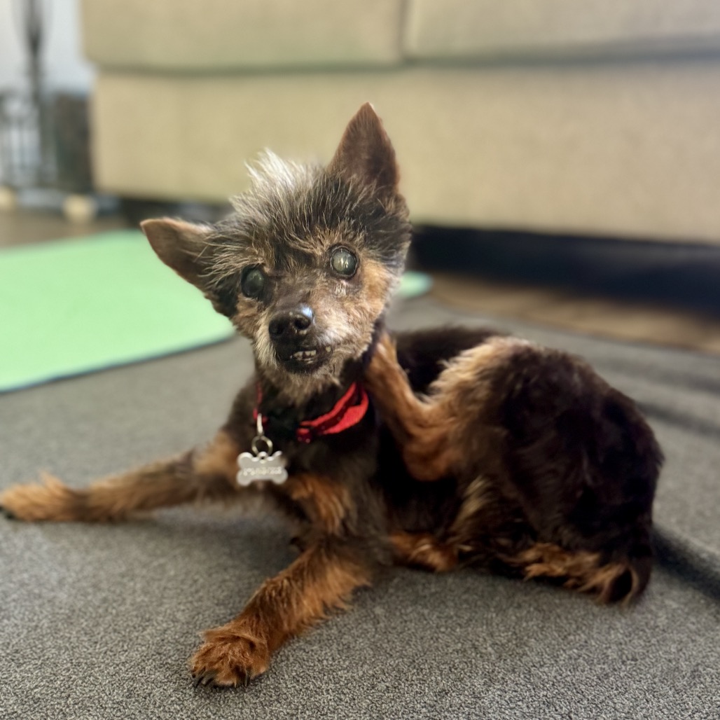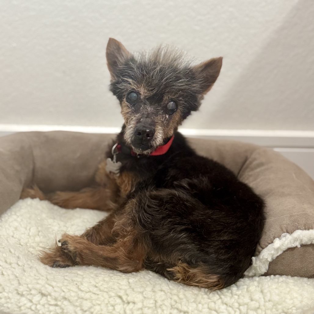 Meet Lupita, our tiny “Little Wolf” with the biggest heart. With her wispy brown/silver coat and scruffy little face, she truly does look like the sweetest tiny werewolf you’ve ever seen. But her personality is pure love. Lupita was found abandoned in a Walmart parking lot, heartbreakingly underweight and in need of care. Despite everything she’s been through, she is incredibly gentle and trusting. She has limited eyesight, so sometimes she’ll let out a little howl if she can’t find you — she just wants reassurance that her person is nearby. Once she knows where you are, she settles right in. She is friendly with other dogs, cats, and even chickens. She thrives in a calm home where she can learn her surroundings and feel secure. Soft beds and cozy blankets are her favorite places to be, especially if she can cuddle right next to you. As a senior Yorkie, Lupita will need a family who understands the special care older pups deserve. Patience, consistency, and lots of love will help her continue to flourish. In return, she will give you devoted companionship and the sweetest snuggles. If you are looking for a loyal little shadow to warm your lap and your heart, Lupita, the Little Wolf, is ready to be your forever girl.