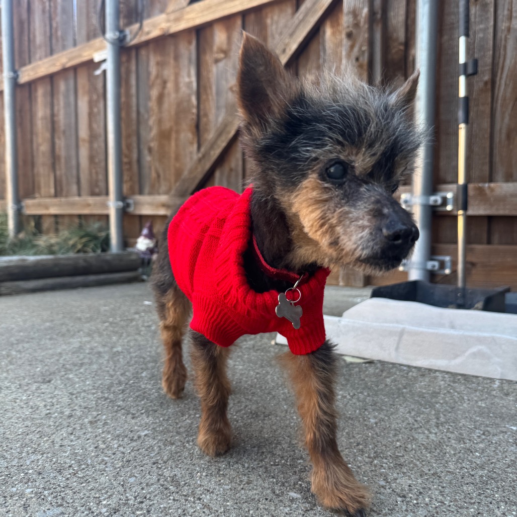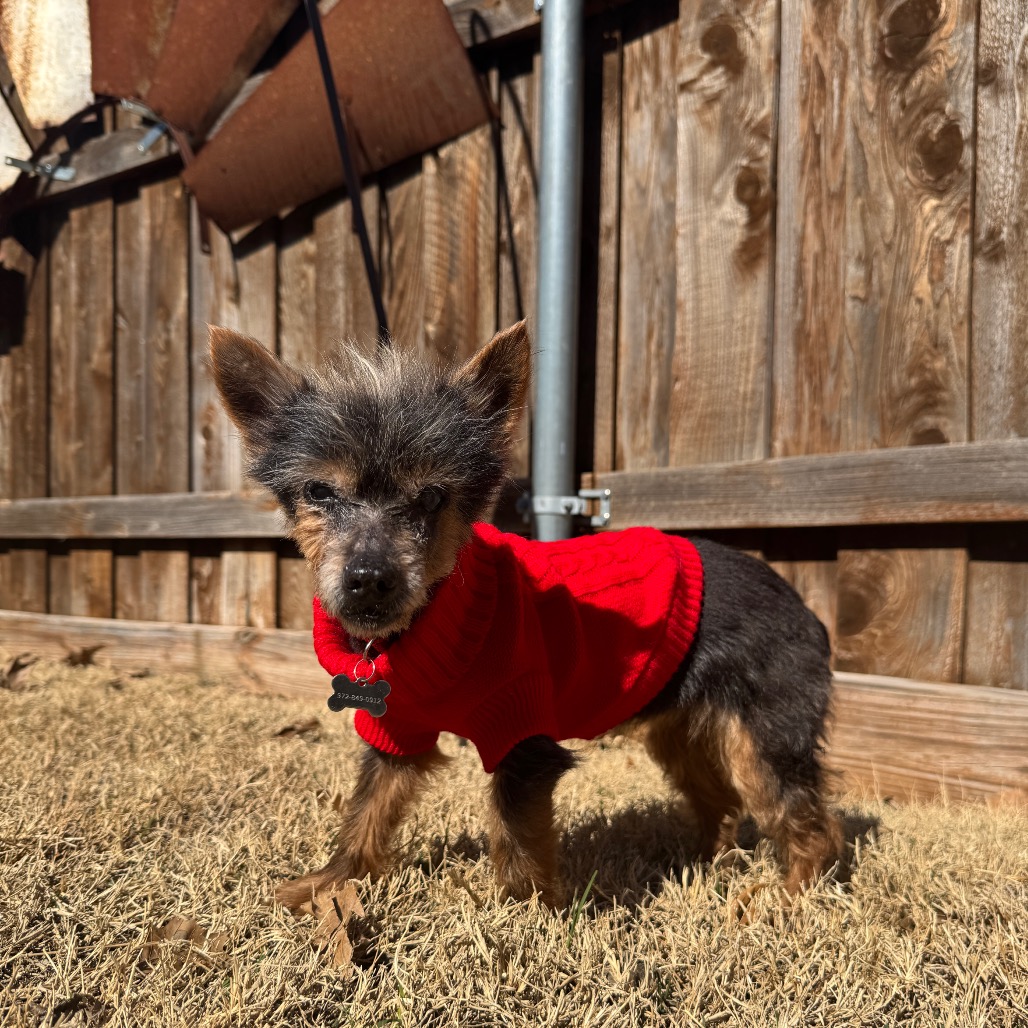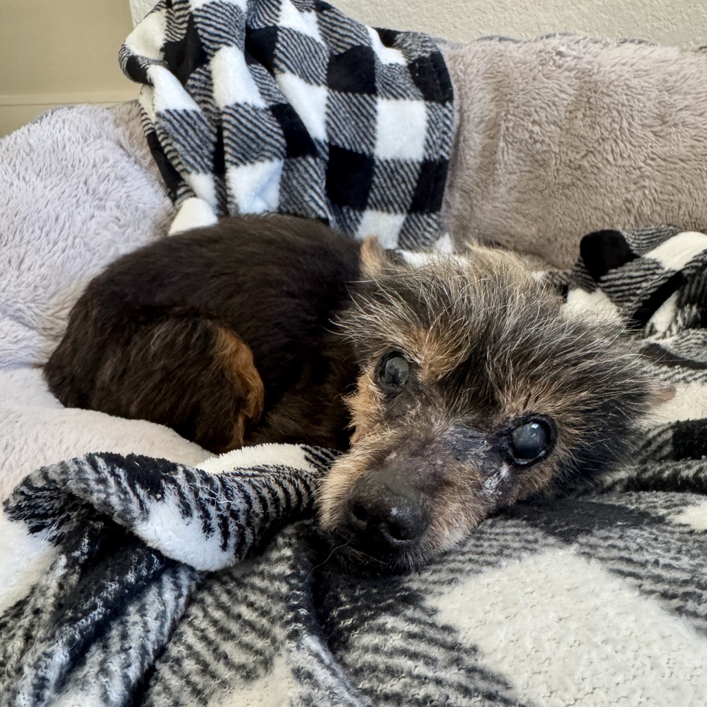Meet Lupita, our tiny “Little Wolf” with the biggest heart. With her wispy brown/silver coat and scruffy little face, she truly does look like the sweetest tiny werewolf you’ve ever seen. But her personality is pure love. Lupita was found abandoned in a Walmart parking lot, heartbreakingly underweight and in need of care. Despite everything she’s been through, she is incredibly gentle and trusting. She has limited eyesight, so sometimes she’ll let out a little howl if she can’t find you — she just wants reassurance that her person is nearby. Once she knows where you are, she settles right in. She is friendly with other dogs, cats, and even chickens. She thrives in a calm home where she can learn her surroundings and feel secure. Soft beds and cozy blankets are her favorite places to be, especially if she can cuddle right next to you. As a senior Yorkie, Lupita will need a family who understands the special care older pups deserve. Patience, consistency, and lots of love will help her continue to flourish. In return, she will give you devoted companionship and the sweetest snuggles. If you are looking for a loyal little shadow to warm your lap and your heart, Lupita, the Little Wolf, is ready to be your forever girl.