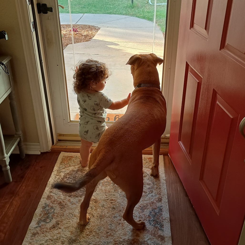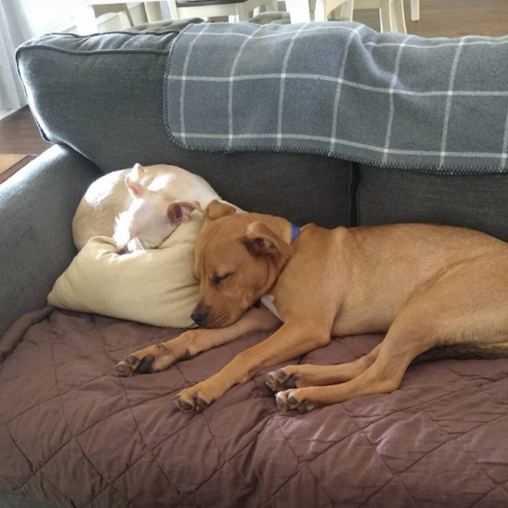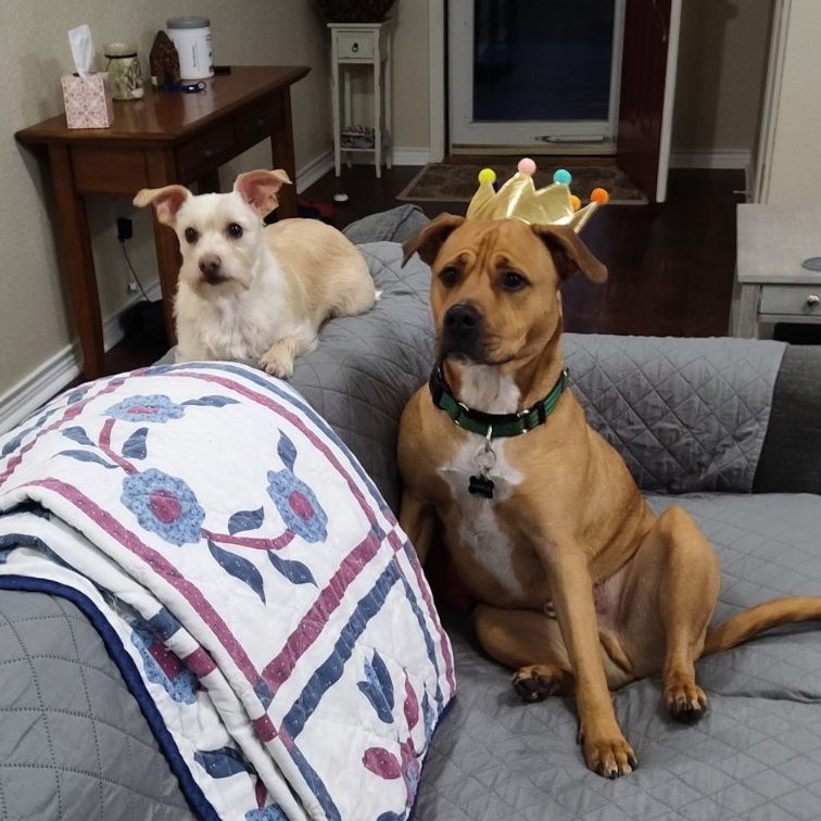 Meet Markus, named for one of the most respected Roman Emperors in history! The Best Dog in the World! Born on February 11, 2022, he is a healthy 70lbs of pure devotion and love; a three-year-old huggy-bear who is a perfect mix of being active and laid back. Originally adopted from a shelter at 7 weeks of age, his cute bio video was so popular that it is still available for viewing, and shelter workers still remember him. When Marky is not lying on his side at our feet, or being babied with a morning face wash from his much smaller older sister, he is sploot-sitting in the kitchen getting ready to take his pretend medicine (cheese nugget).