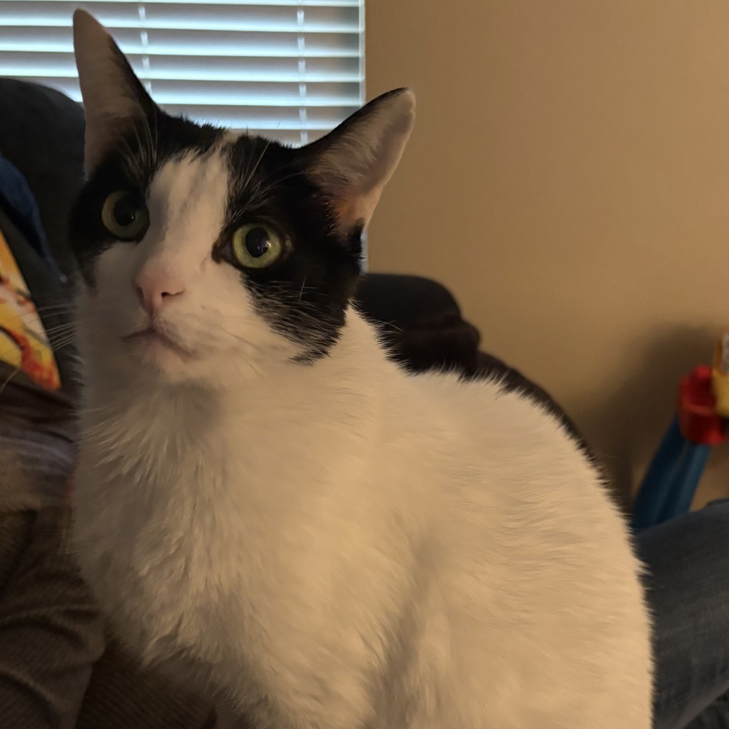 Meet Max! Max is a sweet and playful cat. He is mostly white with black on his face and tail, very beautiful cat and his eyes are beautiful green. My husband rescued him while he was at his job a few years back. Max just came right up to him and crawled up on his shoulders. He was very malnourished, but he is happy and healthy now. He is up to date on his rabies vaccine until 2027, his other vaccine for one year and is neutered. He is also microchipped.