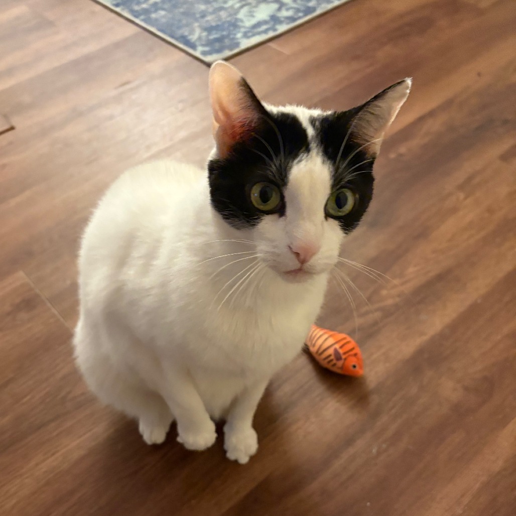 Max is such a sweet and loving cat that deserves the best home. He will cuddle, but he also loves to play with his little fish that we got him for Christmas and he also likes laser pointers for a little bit. He is vocal when he is excited and playing, but it’s very cute. He likes to look out of the window and yell at the squirrels and birds that he wants to play with. Max is pretty good with our four year-old as long as our four-year-old is gentle and lets him leave when Max wants to.