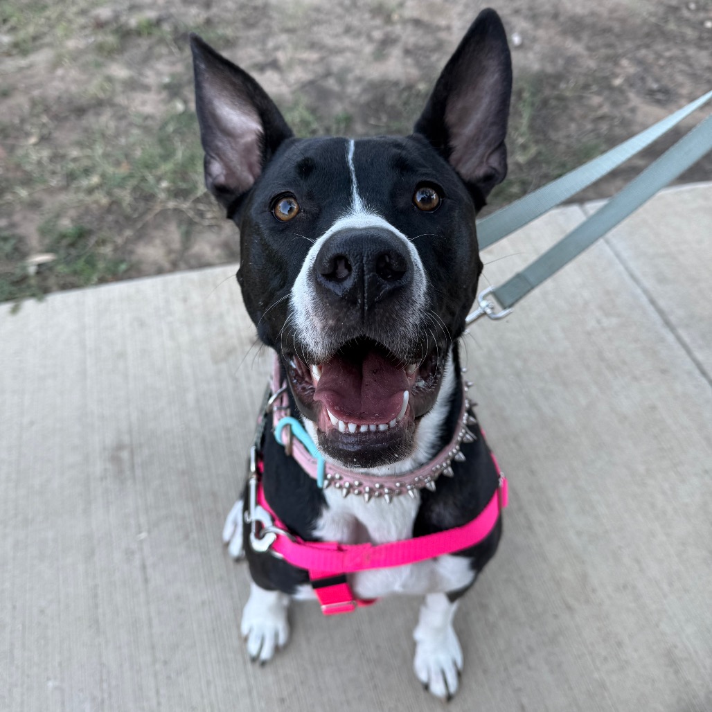 She’s a bit of a spaz (remember her age) and learning to play gently with smaller dogs. She enjoys chew toys and treats, is very interested in everything around her, and we’re working on controlling her urge to jump like a pogo stick!