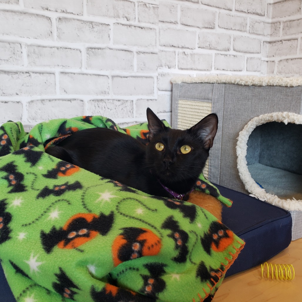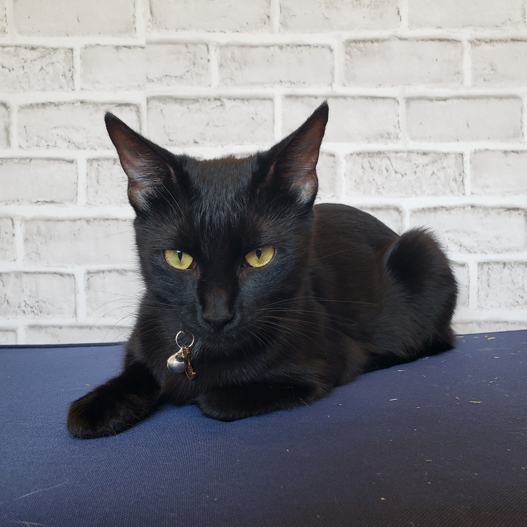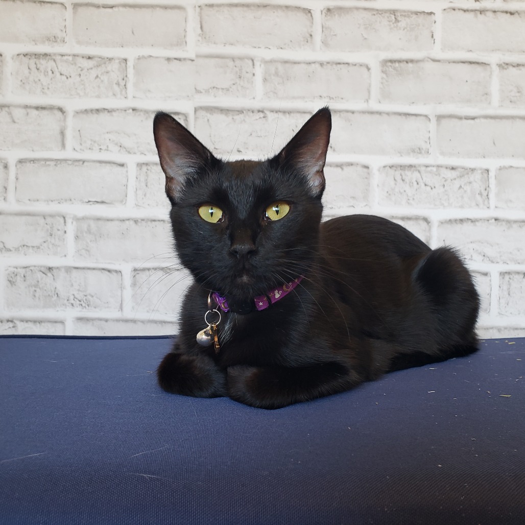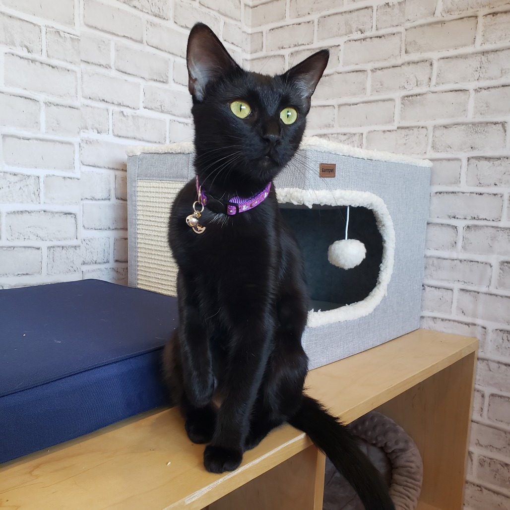 She loves greeting new people, happily accepts scratches and cuddles, and is comfortable being picked up or exploring new spaces. With her moderate energy, she enjoys a balance of playtime and quiet lounging, often wandering the house independently but always circling back for affection. Midnight is crate trained, litter box trained, and adjusting well to indoor life, though she sometimes needs gentle reminders about scratching and still shows curiosity about the outdoors.