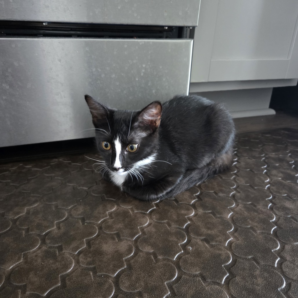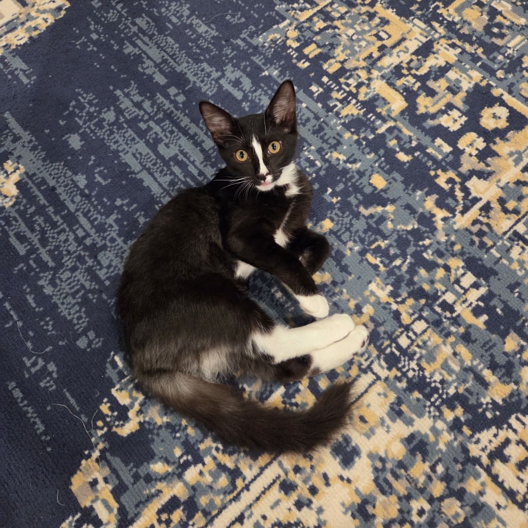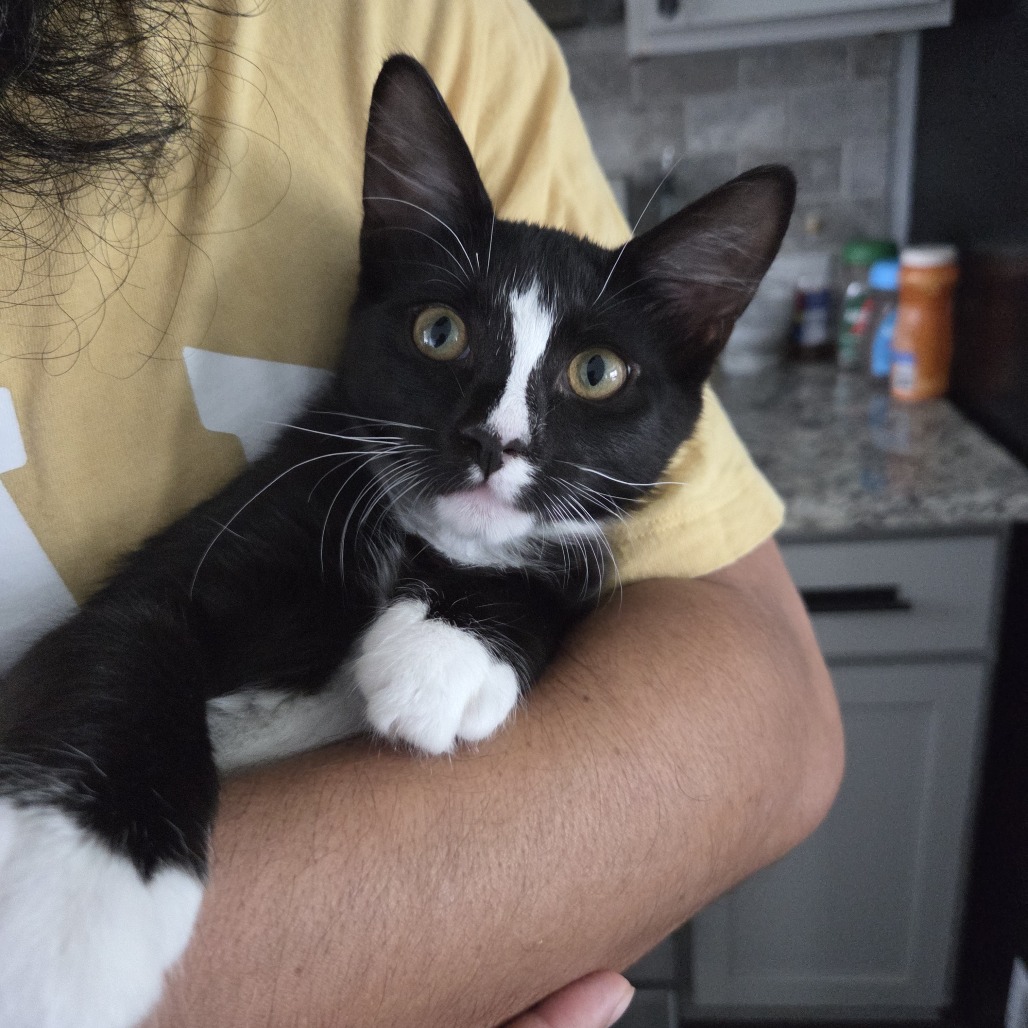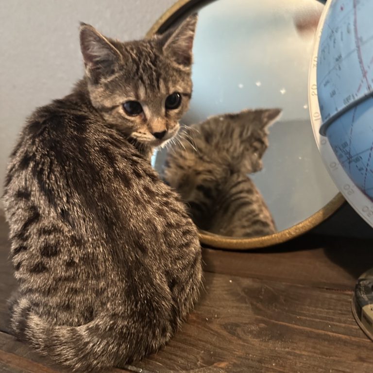 Whiskers, socks, and size – Nebula is a kitten with looks to match her inner spirit. She’s a little girl and when she goes exploring, she can squeeze into small places. She is having fun finding corners and cardboard in her current room as she learns the basics of cat life.