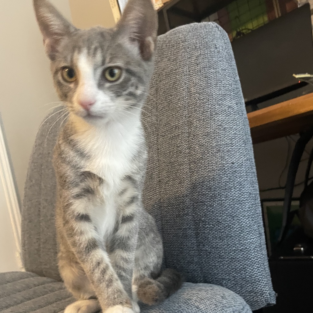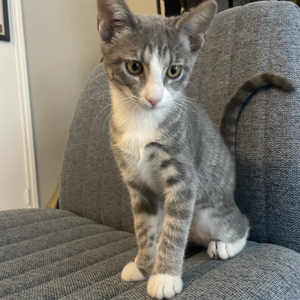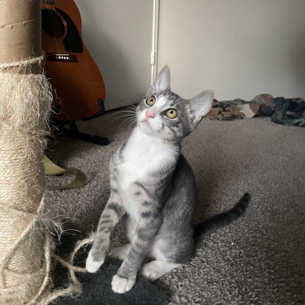 Already litter box trained, Noodle will want to have enough space to explore. She’s always up for a quiet cuddle when fun and games are done. She’ll purr with happiness when she sees her friends, and she’ll likely do well in a home with other cats as reliable playmates. Noodle can be a touch silly, but she can also be easy to love.