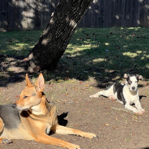Nova is a playful busy bee who loves to chase balls, carry around her stuffed toys, and snuggle. She has recently learned to bring the ball back for it to be thrown again and she gets very excited about it! She gets along with dogs and currently lives with 2 other dogs but is untried with cats. She gets along great with the 5-year-old German Shepherd but has recently started having issues with our 4-year-old Shepherd mix who is no longer tolerant of Nova’s puppy behavior. Nova loves to cuddle up with her humans and is the most affectionate dog I’ve ever had. She also loves cuddling up to the other dogs or making a nest out of her blankets and snuggling down into it. An ideal home for Nova would be one with a yard. She loves to go out and sniff around, chase the other dogs, and sunbathe. She enjoys school age children but hasn’t had any exposure to kids under 6. She would do best with a human that works from home or has other dogs she can seek comfort from when the humans aren’t home. She is a sensitive girl that is moderately high energy and very happy.