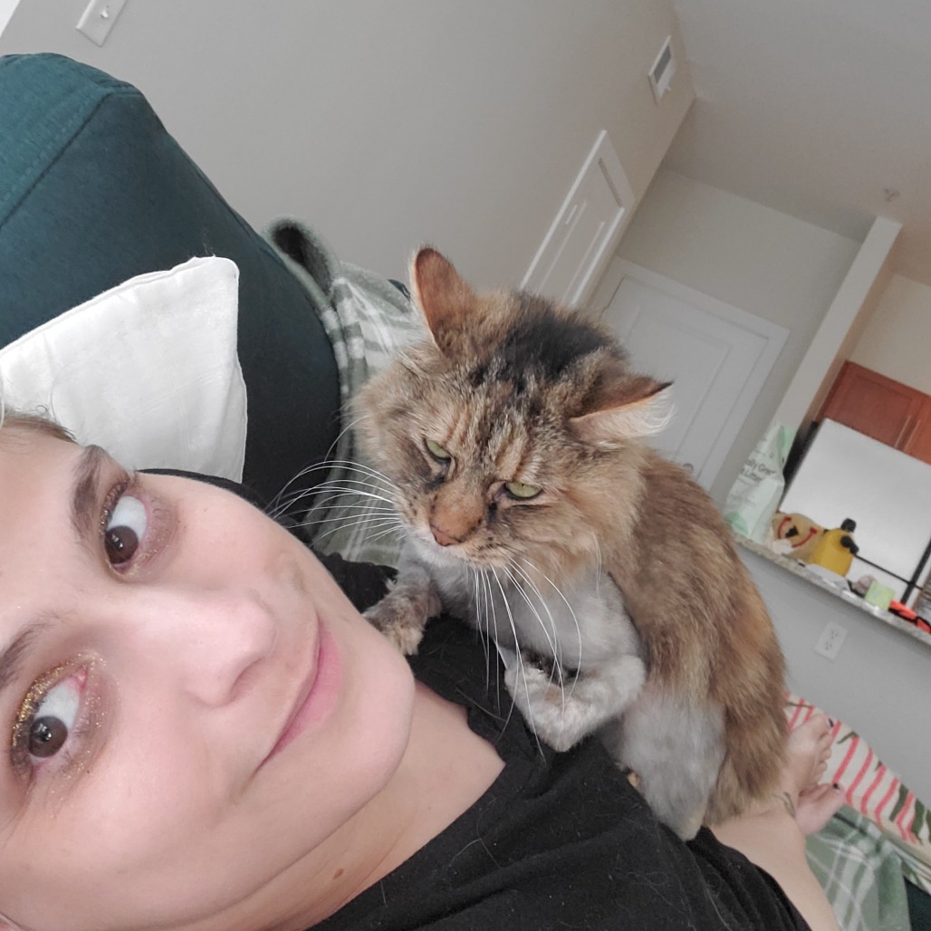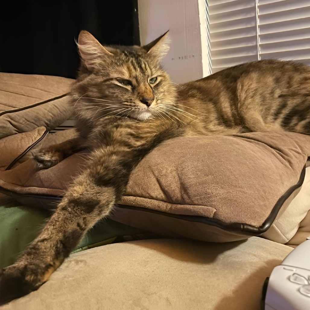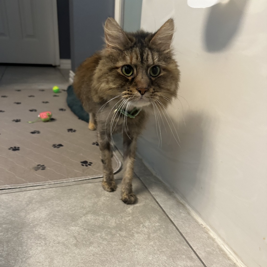 Pickles is an 8-year-old tabby goddess with a heart full of love and a flair for dramatic entrances—seriously, she does a dolphin jump into your arms when she wants affection (which is often). She was deeply loved by her previous human, who heartbreakingly had to surrender her while prioritizing her own mental health and safety. There were many tears, and it’s clear that Pickles has always been someone’s beloved girl.