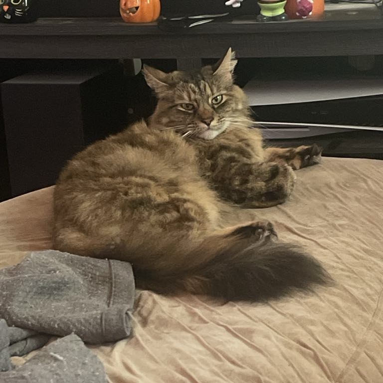 She’s not into a chaotic clowder lifestyle, so she’d do best as the only cat in the home. Dogs? Fine—as long as they give her respectful space and don’t try to cramp her cuddle game.