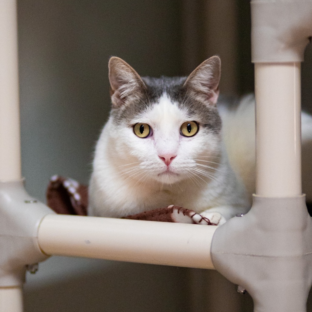 I’m Riggs. I’m a handsome white and gray cat with a shy personality and very clear boundaries. I don’t enjoy human affection or handling, but I do have a playful side—especially when treats are involved. I love a good play session and will happily engage when toys come out, as long as things are on my terms.