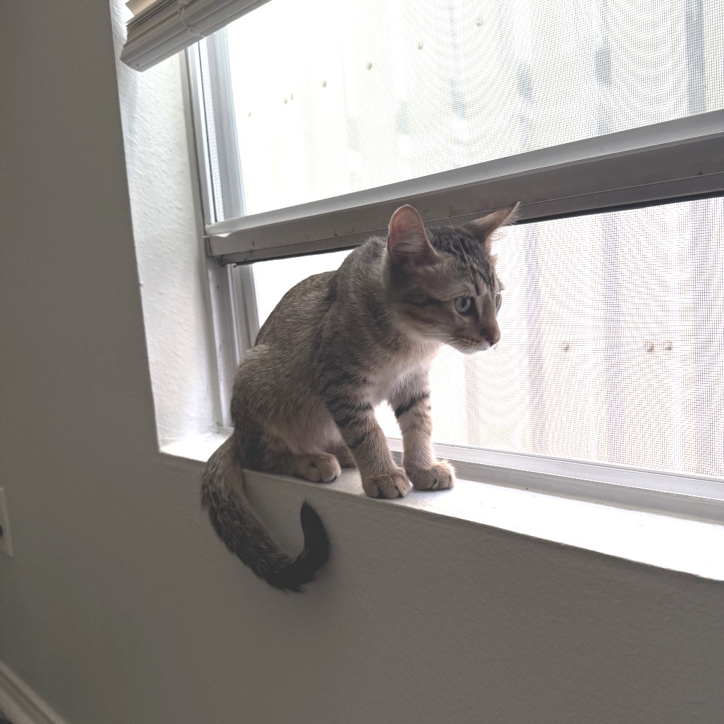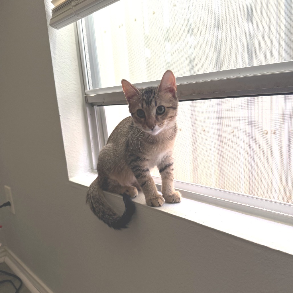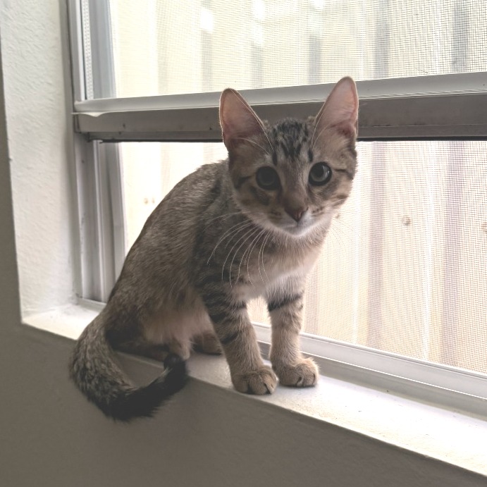 He is a moderate energy and intelligent cat who loves to play with his humans and siblings and would do well in a household with children or other cats for him to bond and play with!