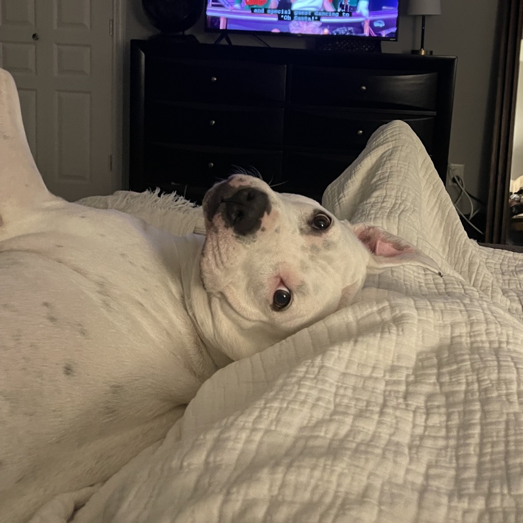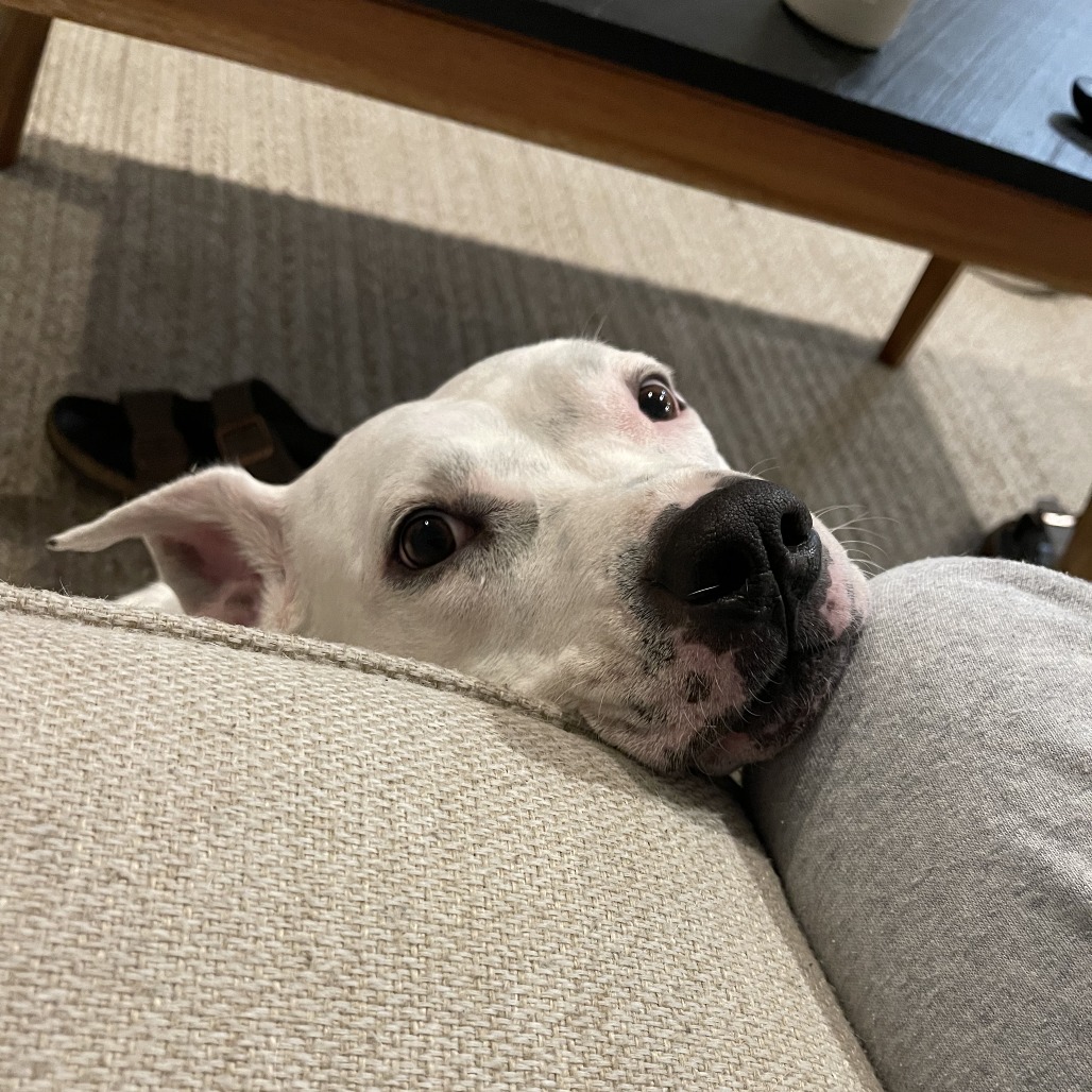 Looking for a loyal cuddle buddy who will happily keep your couch warm and your heart even warmer? Meet Snow, a 5-year-old Pitbull with a heart of gold and a serious love for humans.