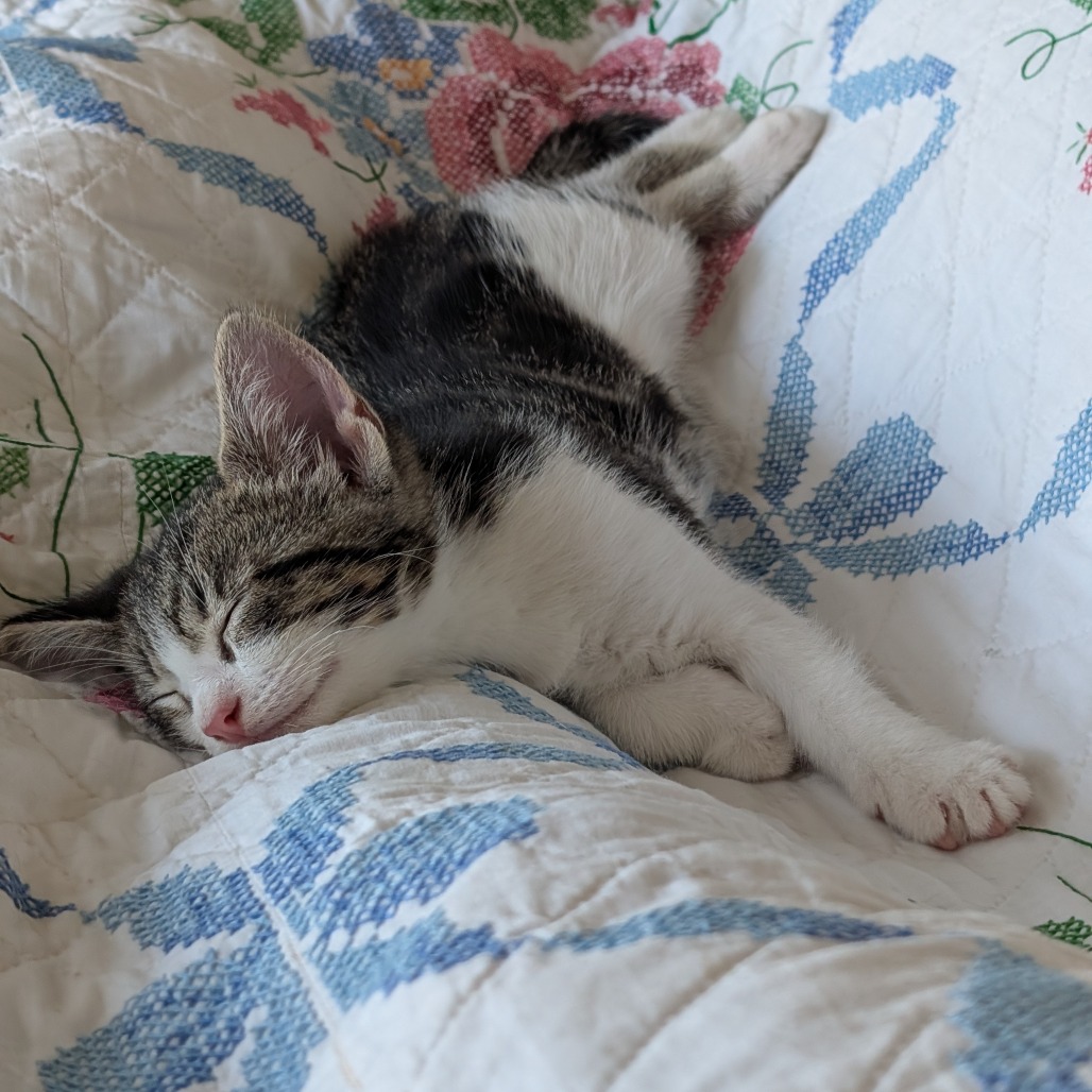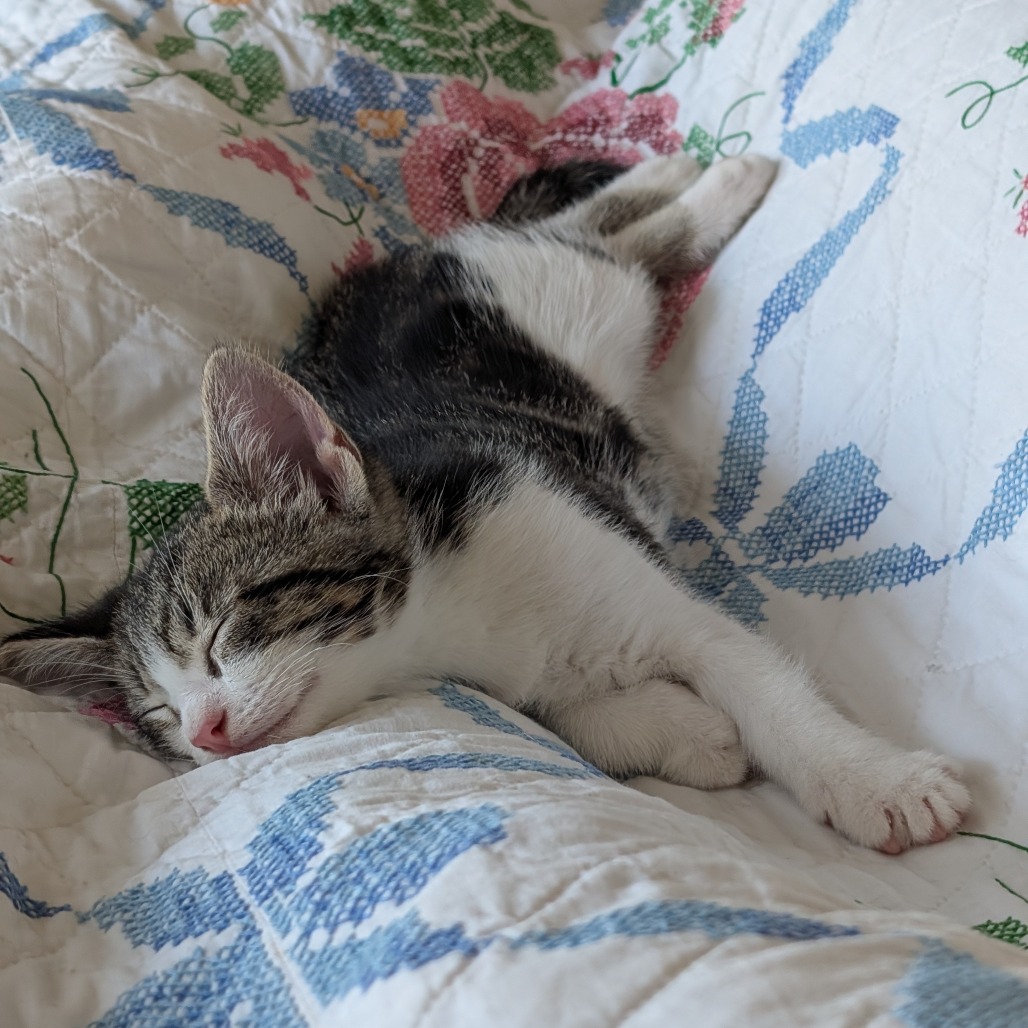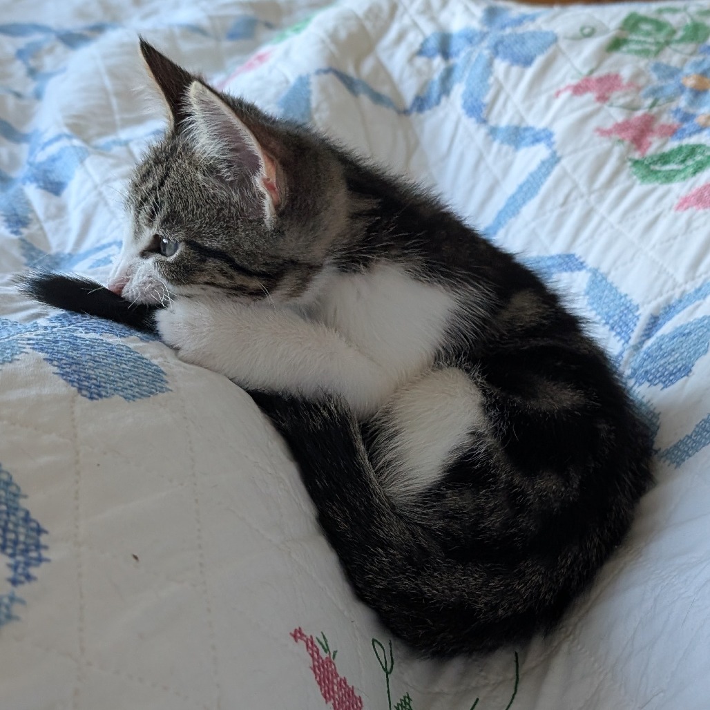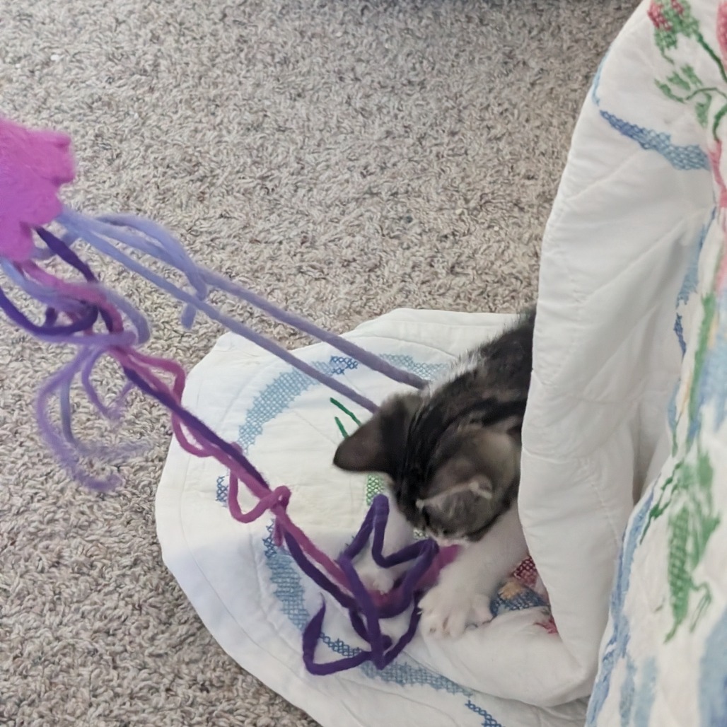 Spats also knows how to be a cuddly kitten. He uses a soft paw to get extra attention. He’s proven himself to be well behaved with a variety of family members and balances his playfulness with his affection.