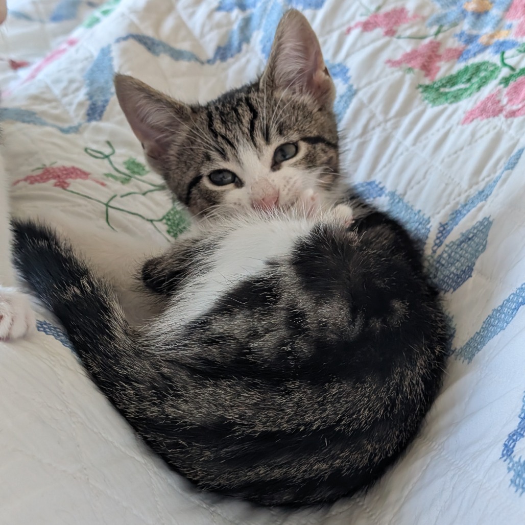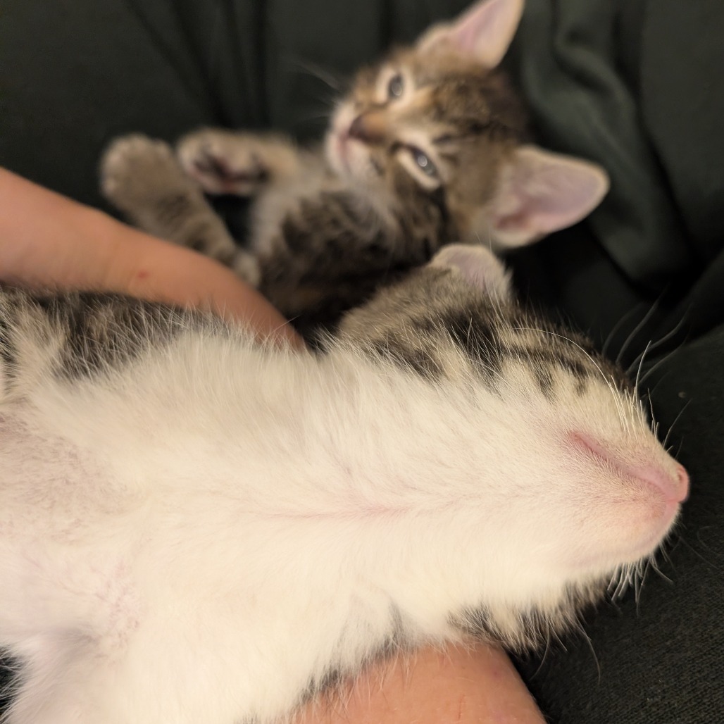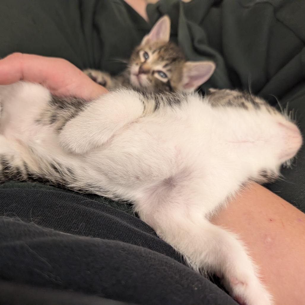 He’s still too young to be around other animals but has taken charge of his siblings. This biggest boy is a gentleman, and Spats is already litterbox trained. Once he’s fully weaned, he’ll be ready to brighten any household.