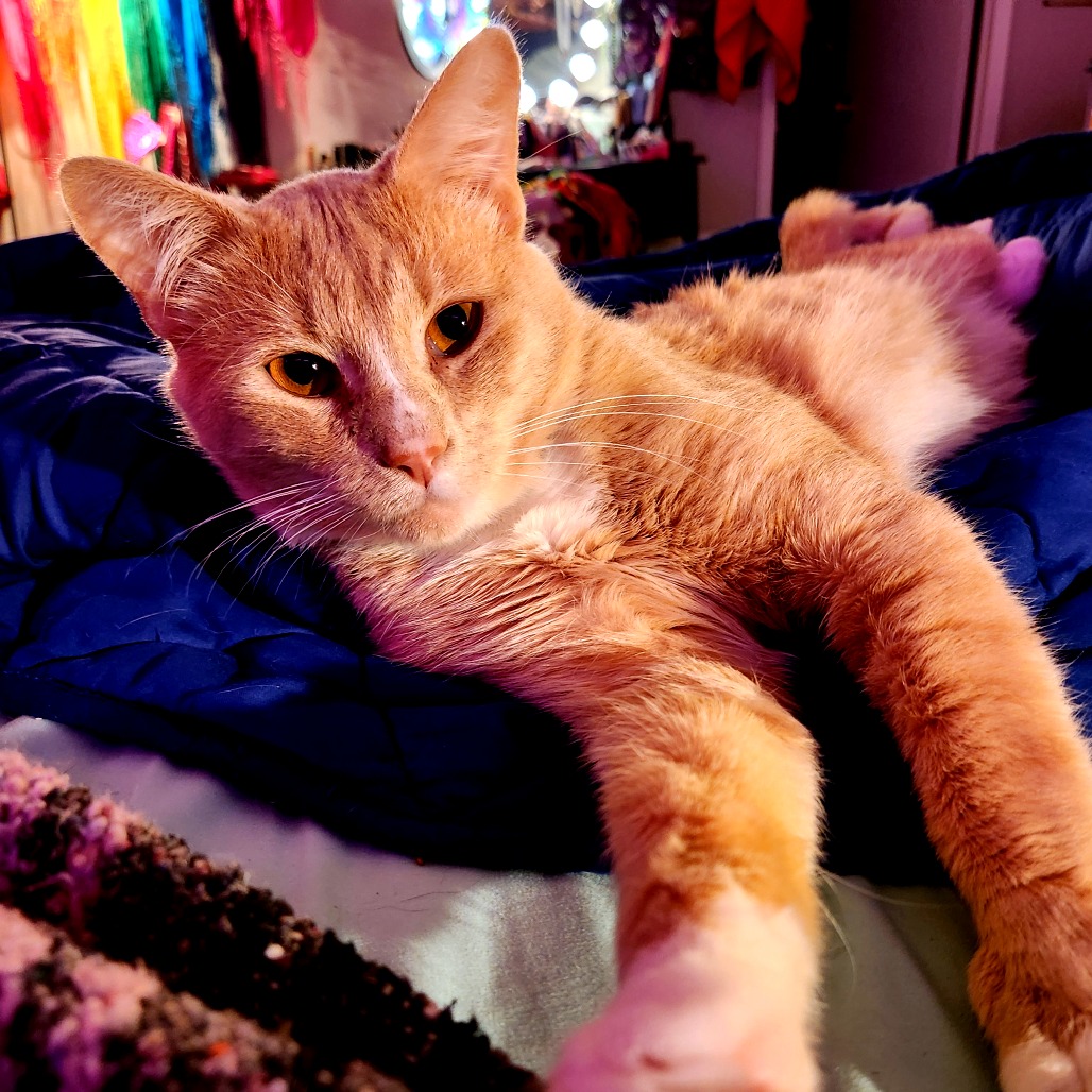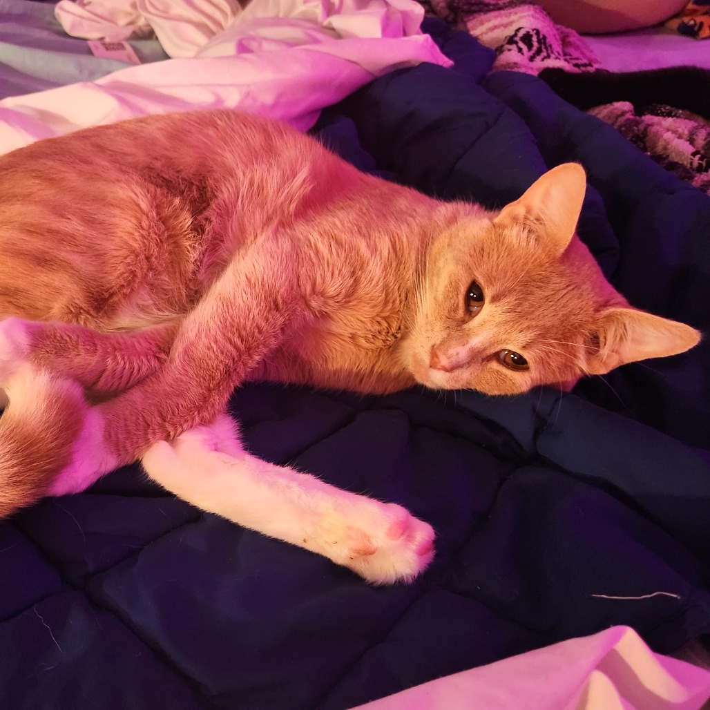 Sunshine enjoys wandering the house and doing his own thing, but will always return to his human for the affection and attention he craves! He still needs slight supervision to discourage scratching on things you might not want scratched but again, he is adjusting and learning what domestic bliss is all about! He would prefer to be the only cat, with the exception of his sister Midnight!
