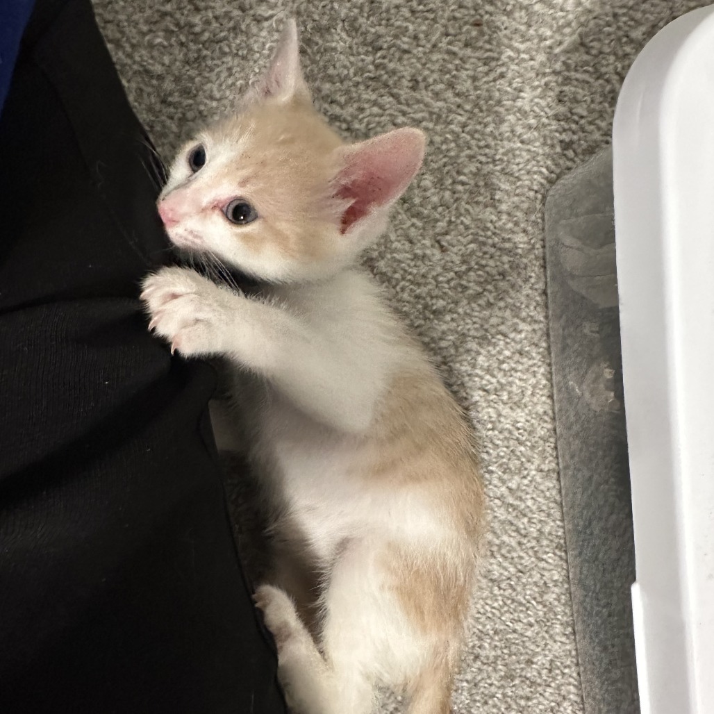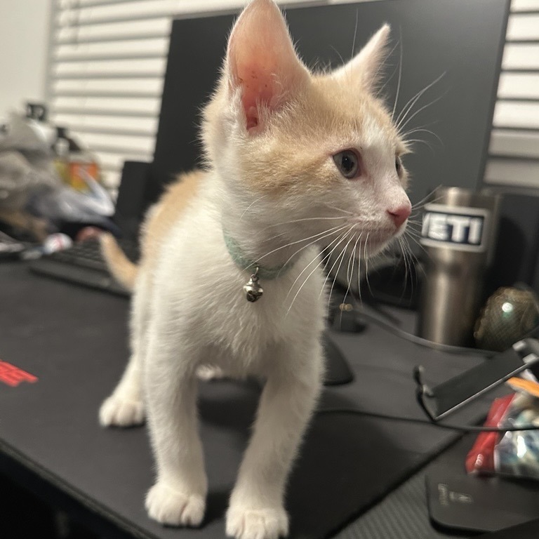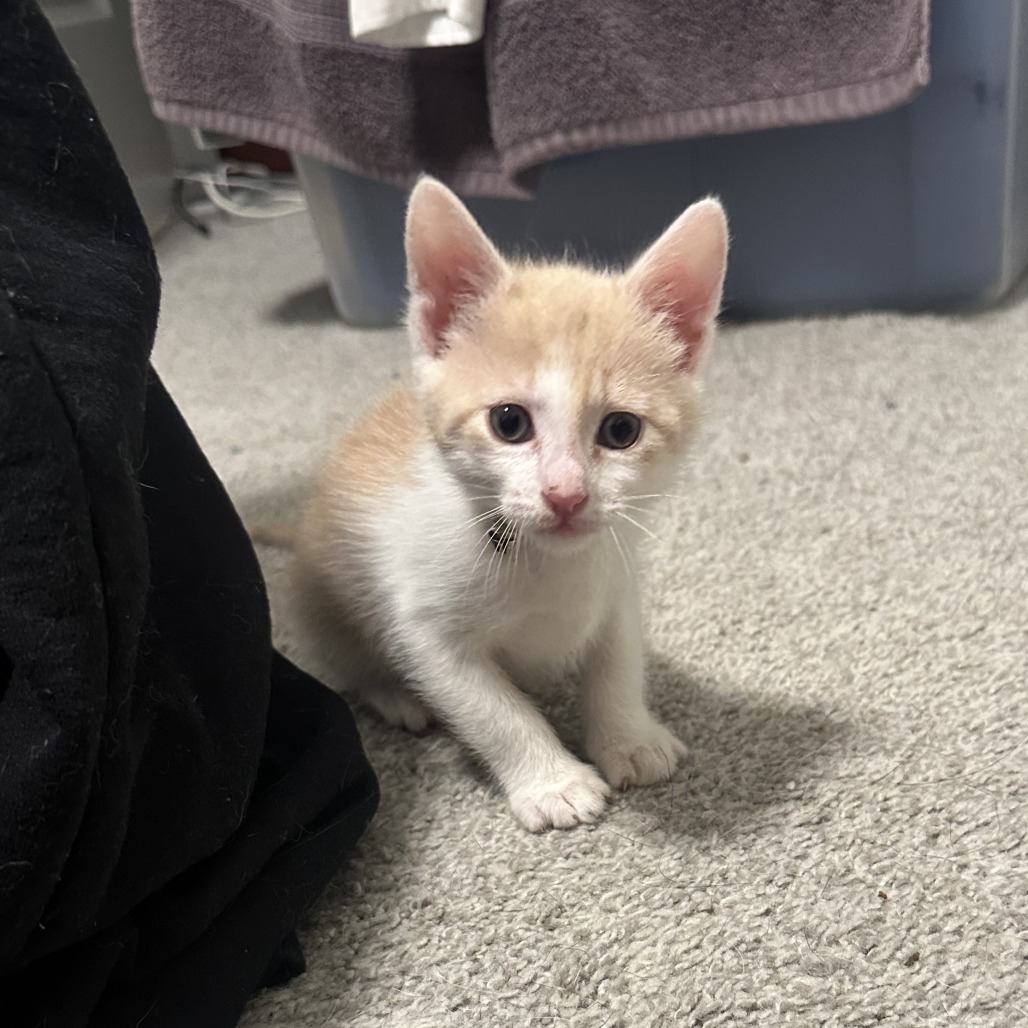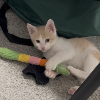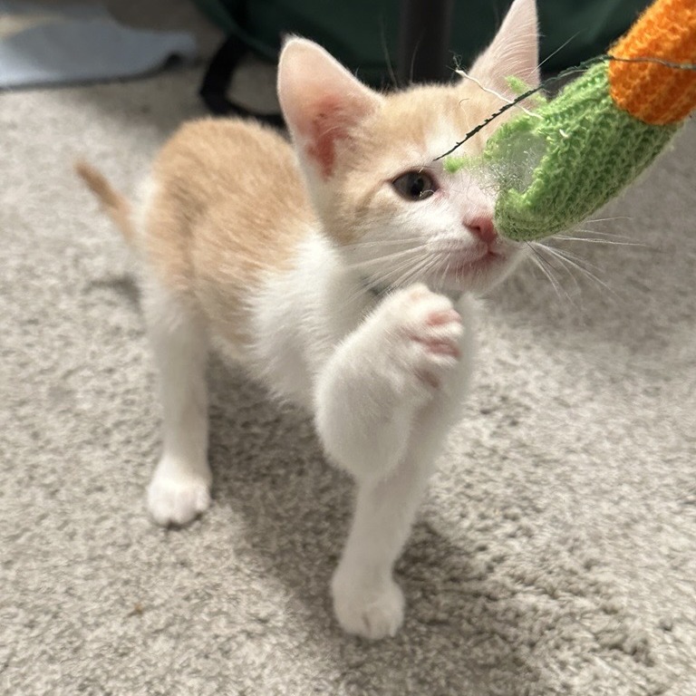 Meet Sweet Potato – a snuggly ball of cuddle and play! Sweet Potato originally had littermates, but lost his siblings and he was the only kitten left. His new-sister Daphne was also a single kitten and needed a friend. They met each other as babies and have been inseparable ever since! Sweet Potato is considered moderate energy for a kitten – still a kitten, but is very much on the snuggly and cuddly side of the spectrum! His favorite toys are springs, tiny snakes and rattle mice. His personal vice is he looves being held like a baby – on his back, paws in the air, while you rock and sing to him. He met a dog and did great! He also gets along great with other kittens/cats.