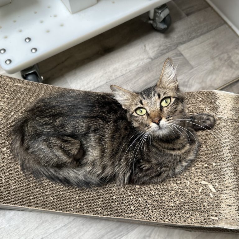 Theodora is a stunning cat with mesmerizing eyes that tell a story of quiet resilience. A unique blend of tortie and tabby, she carries an air of elegance and mystery, preferring to observe the world from her favorite windowsill or the cozy safety of her cat tree cave. Theodora came into our care cautious and wary of people, but her patient foster has given her time and space and she’s really blossomed. She’s now very affectionate in your lap for a few scratches and is the sweetest girl, but she still likes having her own room and space to sleep in.