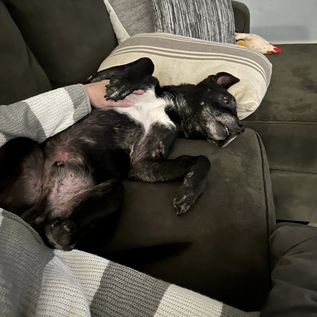 He doesn’t mind other dogs and will sometimes join them in barking at the mailman or the neighbors. But mostly, he is just happy to have his humans nearby where he can keep a watchful…and leisurely….eye on them.